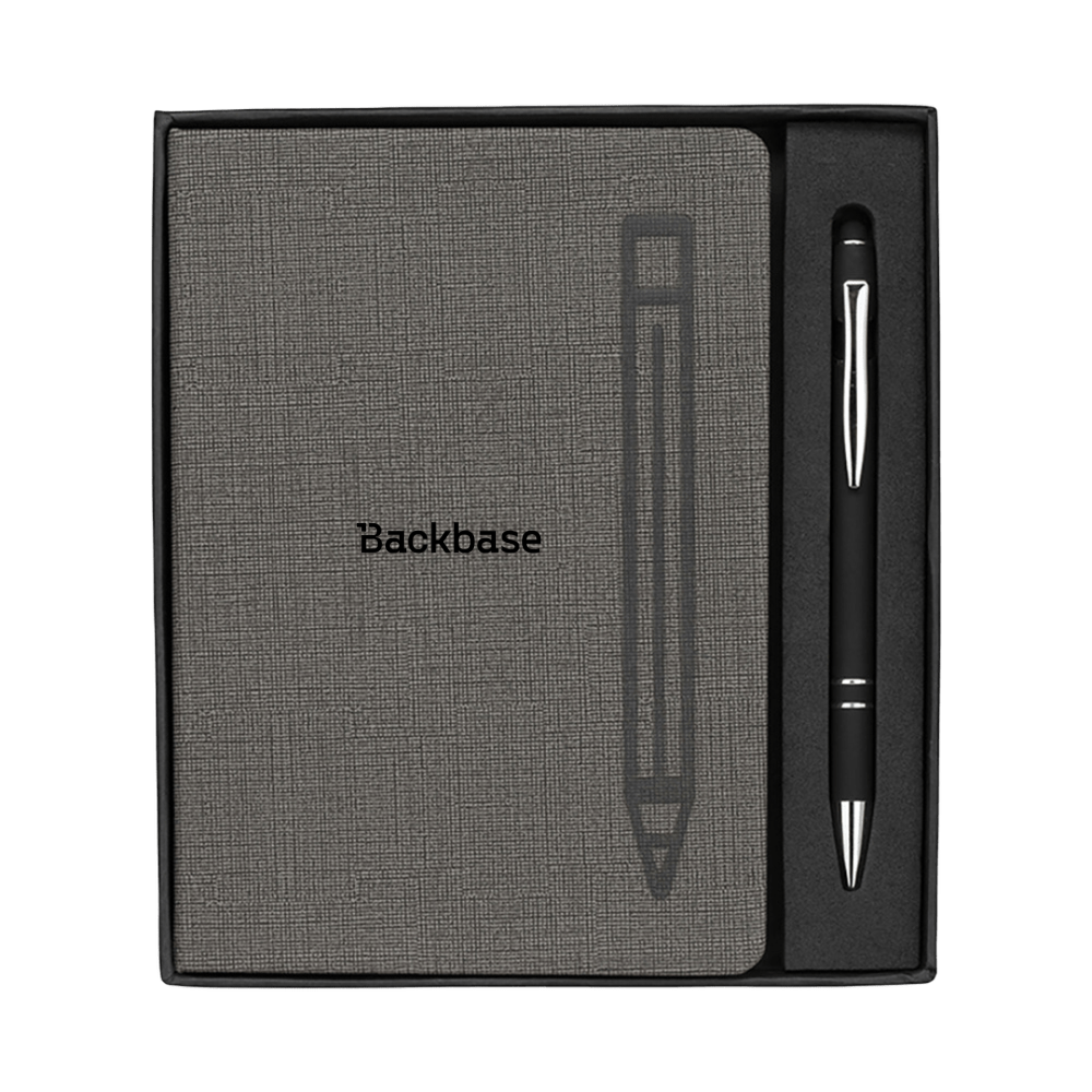 The Manhattan gift set includes a journal with textured grey cover and a soft-touch pen, enclosed in a classic black gift box. The notebook has 80 cream colored lined pages and comes with a bookmark. The aluminum plunge-action ballpoint pen has an elegant look, a rubberized finish and capacitive stylus. Keep your pen in place by setting it on the magnetic imprint of the pen on the journal cover. 6 5/8" W x 7 1/2" H x 3/4" D